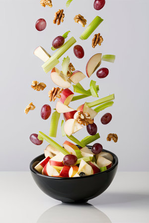 Fresh salad in black bowl with flying fruits and nuts on white background