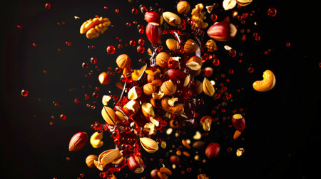 Nut mix. Close-up of nuts and red drops of syrup on a black background. Pistachios, cashews, almonds, walnuts and hazelnuts are scattered throughout the image. A healthy snack