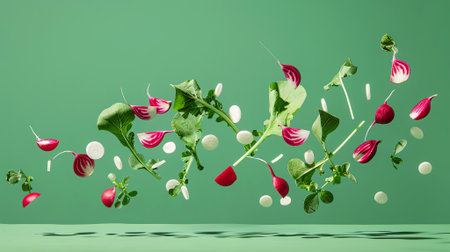 Fresh greens and vibrant radishes dance in a mesmerizing, gravity-defying composition. Experience a refreshing burst of nature's palette. Generated A.I.