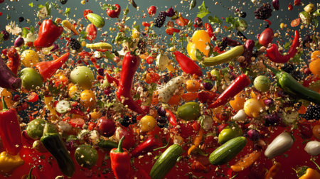 A vibrant splash of fresh fruits, vegetables, and spices creating a colorful and dynamic scene.