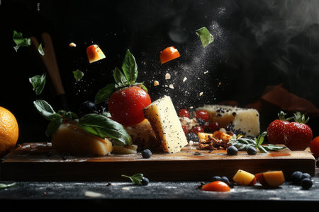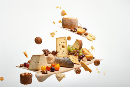 A captivating image featuring a delightful display of various cheeses, meats, and fresh fruits, artistically suspended in mid-air, evoking culinary creativity.