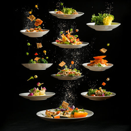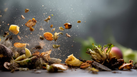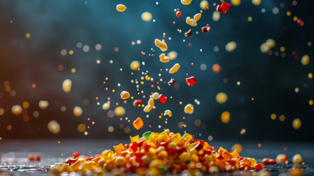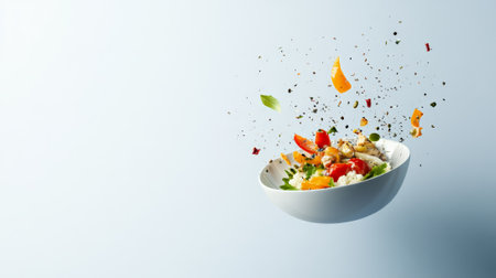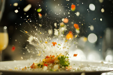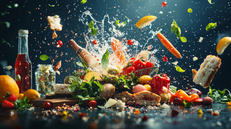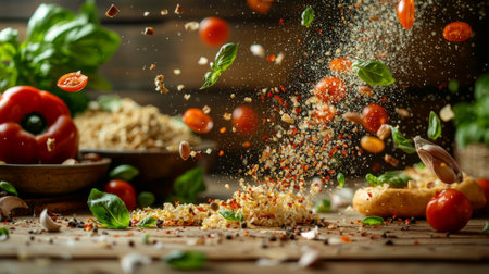 A dynamic food scene capturing colorful ingredients like vegetables and spices flying through the air, creating an exciting culinary atmosphere perfect for showcasing vibrant dishes.