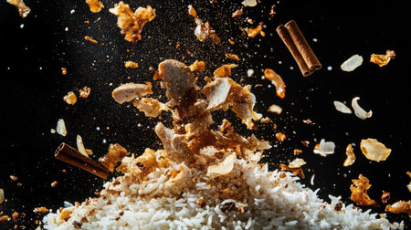 Mid-air shot of chicken biryani ingredients--chicken, rice, cinnamon sticks, and fried onions--flying against a black background,