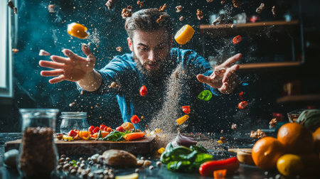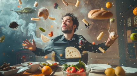 A dynamic image of a chef surrounded by flying food ingredients like bread, cheese, and vegetables, creating a playful and chaotic atmosphere.