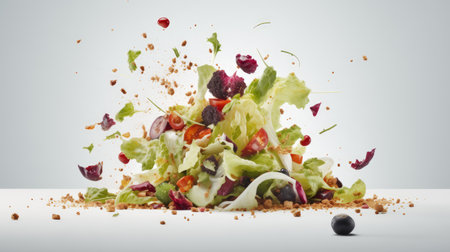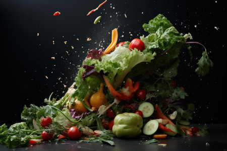 Dramatic motion capture of a vibrant salad explosion with vegetables, bread, and dressing mid-air against a dark background, showcasing dynamic energy.