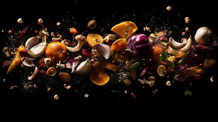 An artistic arrangement showcasing a vibrant mix of fresh vegetables, fruits, and spices, creating a stunning visual explosion against a dark background.