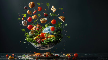 Floating Fresh Ingredients and Earth Globe in Artistic Culinary Display