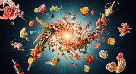 A dynamic and colorful explosion of various foods, ingredients, and drinks radiates from a bright central point, forming a spiral galaxy of flavor. Fruits, vegetables, meats, cocktails, and desserts are captured in a creative, zero-gravity display. This abstract image represents a fusion of flavors, culinary creativity, and a celebration of gastronomy.