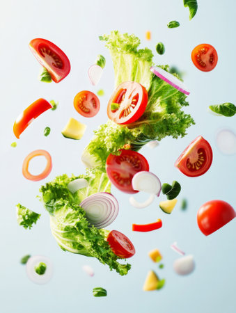 Fresh vegetable salad ingredients in mid-air with tomatoes, lettuce, and onions.