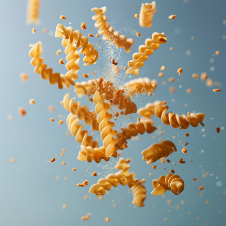 A stunning image showcasing pasta and croutons suspended in the air on a light blue background, highlighting creativity and culinary artistry in food photography.