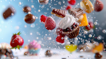 This dynamic and vibrant image captures an explosion of desserts, including cakes, chocolates, and berries, creating an enticing and playful scene perfect for any sweet-themed project.