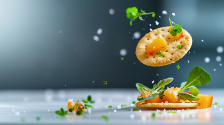 A visually striking image featuring a crispy cracker topped with fresh ingredients and herbs, suspended in air amidst a sprinkle of sea salt, perfect for culinary presentations.
