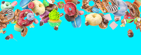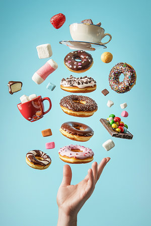 Assorted donuts, marshmallows, chocolate bars, and coffee cups floating against a blue background.