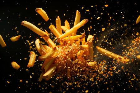 French fries mid-air explosion with golden crumbs and seasoning in flight, capturing the energy and dynamic motion of a comfort food favorite.