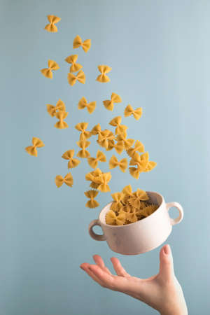 Italian pasta pattern on a colored background. A female hand catches or tosses a bowl of Farfalle pasta with a bow tie. Flying food concept. Levitation. Vertical position