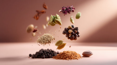 Captivating image showcasing an artistic arrangement of floating spices and herbs. Perfect for culinary themes, healthy eating, and artistic visuals.
