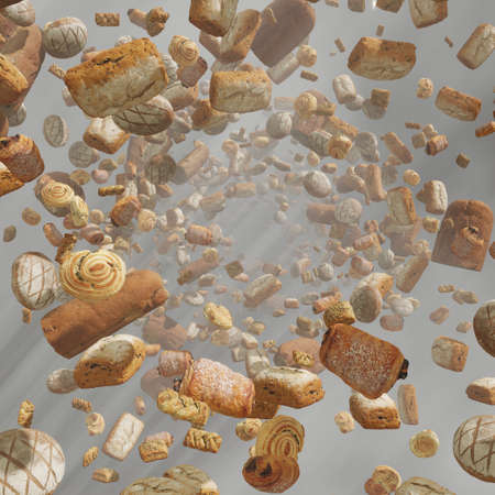 A captivating image of a bread roll breaking apart, sending crumbs and fresh ingredients soaring through the air, showcasing dynamic food artistry and culinary motion.