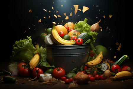 Trash cans, garbage pile, and whole foods like banana, tomato, zucchini, fried chicken leg, steak