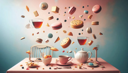 Surreal floating tea party with biscuits and macarons suspended in mid-air against pastel background, Ai created image