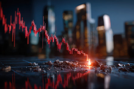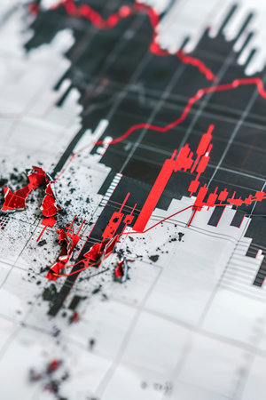 Investment charts crumbling into dust, symbolizing financial collapse and uncertainty.