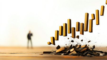 A growing bar graph with concrete bars shows an upward trend while crumbling on the right side, symbolizing challenges in growth and stability.