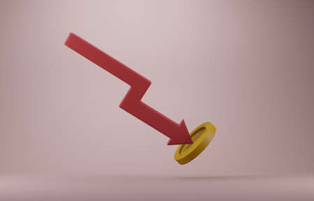 3D red down arrow hitting coin, financial crisis, decrease in value of money due to inflation or recession, stock market crash concept, 3d illustration.