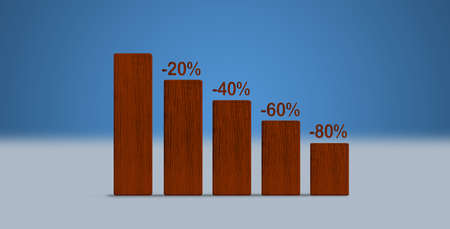 Decrease percentage in wood chart bar with discounts Numbers percent value. promotion and price down concept