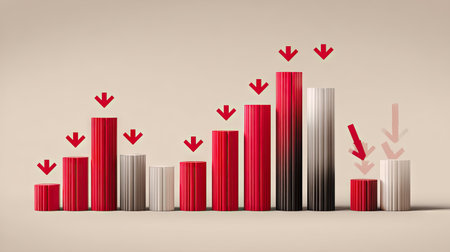 This image presents an abstract representation of financial trends using red and gray bar graphs, showcasing both upward and downward movements in market data. Ideal for business and finance presentations.