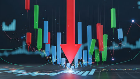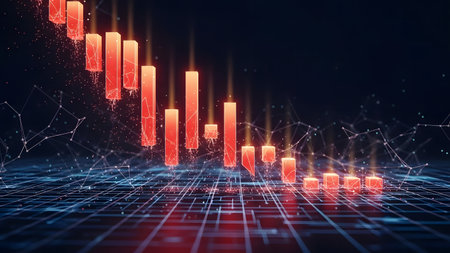 This image showcases a dynamic financial downtrend represented with a blend of abstract data points and graph lines, ideal for economic analysis and market insights.