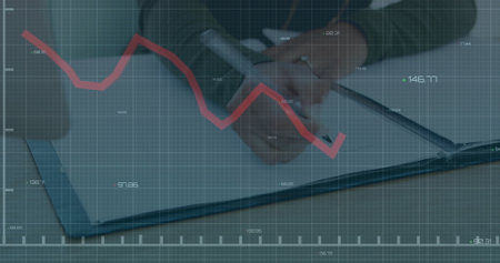 Image of a red statistic line over a grid with numbers and markers decreasing on digital display. Global finances and statistics concept digitally generated image.