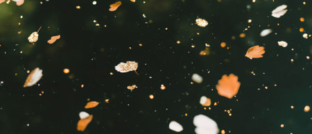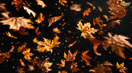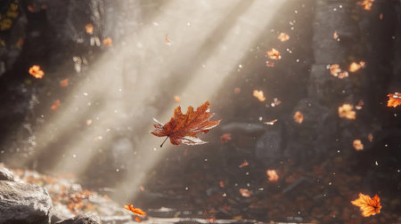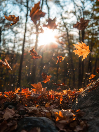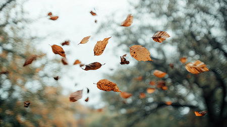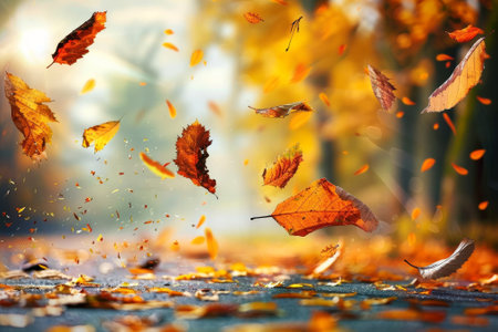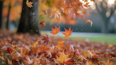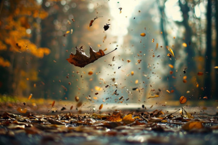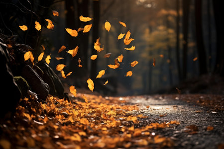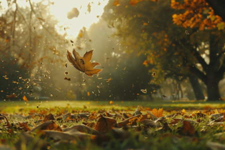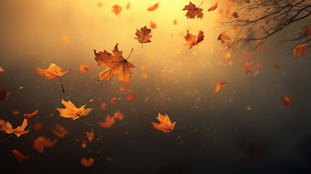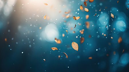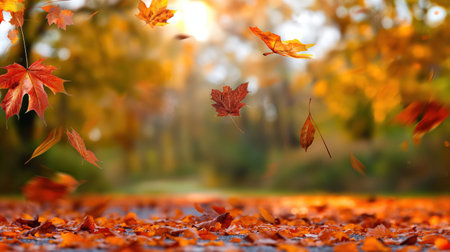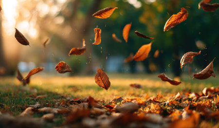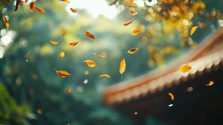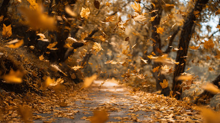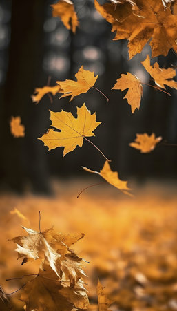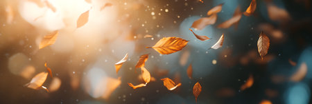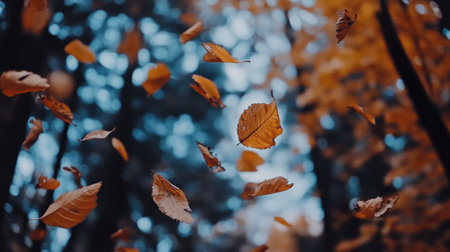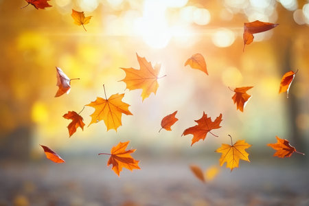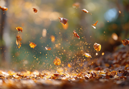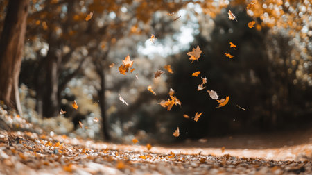 Autumn leaves dancing in the wind create a picturesque scene, enhanced by a magical golden bokeh effect that adds a serene and vibrant touch to the fall atmosphere