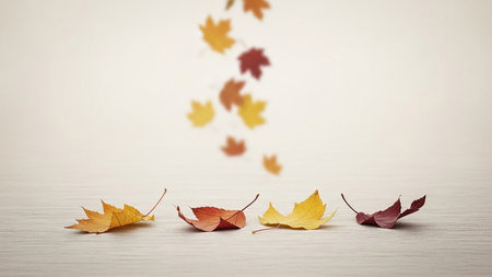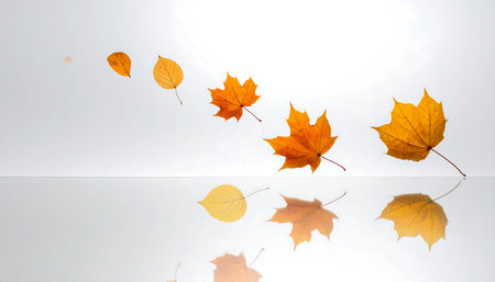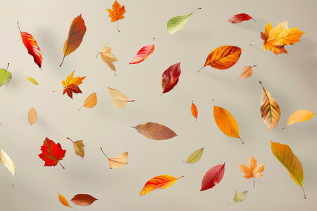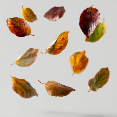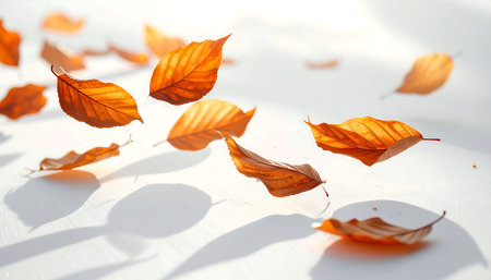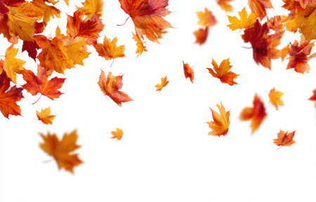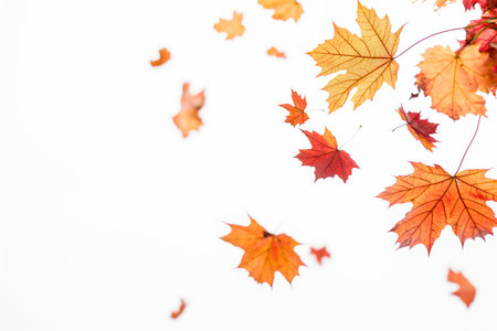 Imagine autumn leaves drifting against a white backdrop, displaying vibrant colors that evoke nostalgia and tranquility, perfectly capturing the essence of the seasons breathtaking transformation