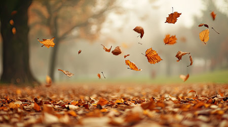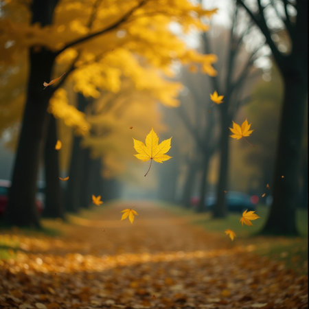 Golden autumn leaves fall gracefully along a tree-lined path shrouded in soft mist. The atmosphere evokes tranquility and nostalgia, with vibrant foliage creating a picturesque scene