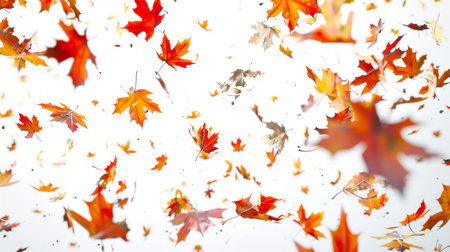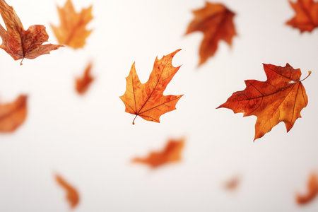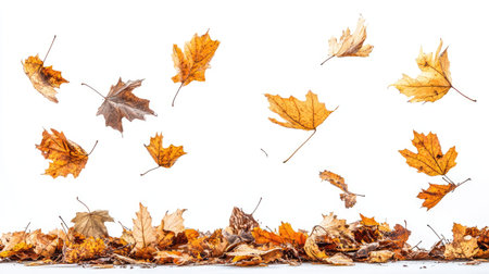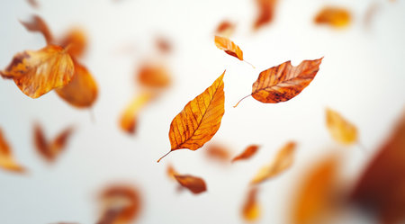 A beautifully serene image showcasing autumn leaves as they gently float against a pristine white background, perfectly capturing the true essence and beauty of the fall season in all its glory