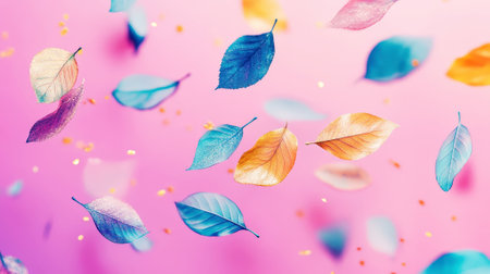 Aesthetic pastel blue, gold, purple glittering autumn leaves floating on dark purple background. Generative AI.