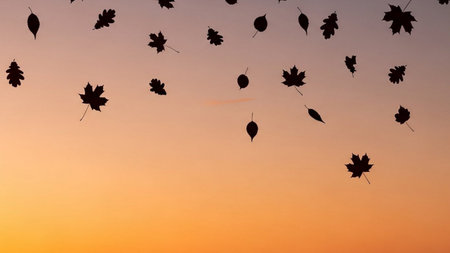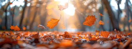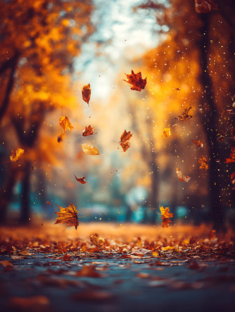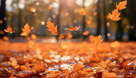 Falling autumn leaves in a park on a sunny afternoon. Warm, orange tones prevail. The serene image captures the beauty of the season.