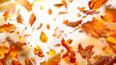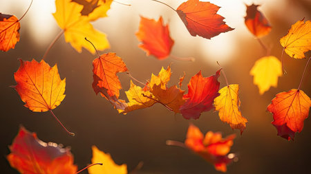 Brown, orange, and yellow leaves flying in the air with strong backlight and soft-focus background