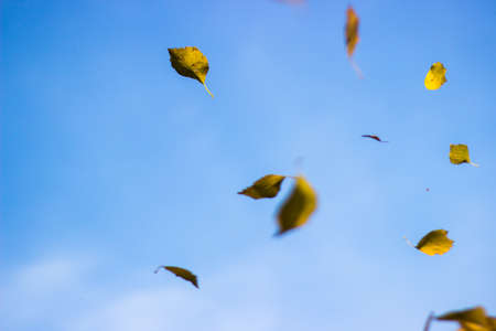Falling autumn leaves, fall, yellow and red against the sky and tree branches in October park background