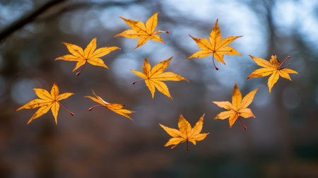 Golden leaves twirling in the autumn breeze. Peaceful nature scene.