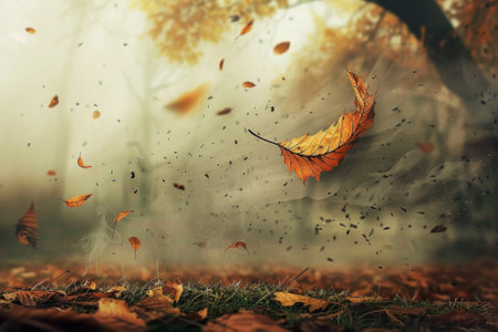 Autumn wind creating a flurry of dry leaves across an open park lawn