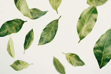 Fresh bay leaves gently float in the air, displaying rich green hues and intricate textures that enhance their natural beauty.
