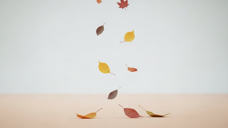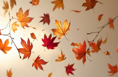 Vibrant orange and brown leaves are captured mid-fall against a smooth beige background, showing the beauty of autumn as they gently descend to the ground.