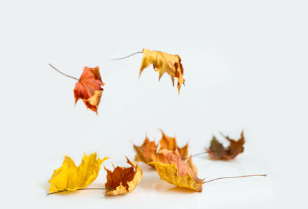 Golden and red autumn leaves fall against a pure white background