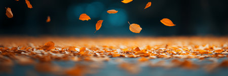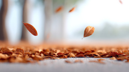 Dry orange leaves gently falling onto a blurred path, creating a warm toned carpet during a serene autumn day, evoking a sense of tranquility and the beauty of the changing seasons