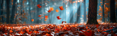 Vibrant red maple leaves swirling in the air, a fall scene in a blurred forest path