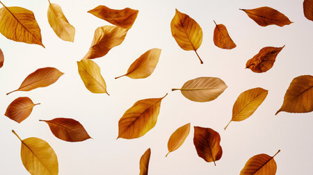 Beautiful arrangement of golden brown autumn leaves floating on a white background, creating a serene and calming atmosphere perfect for seasonal decor.