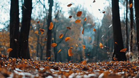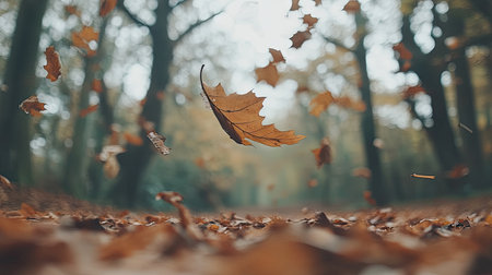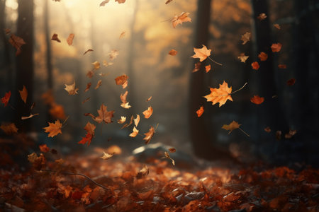 An autumnal woodland scene with falling leaves AI generated