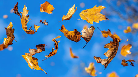 Captivating autumn scene featuring vibrant orange leaves gracefully falling from a tree against a bright blue sky. A perfect representation of nature's beauty.