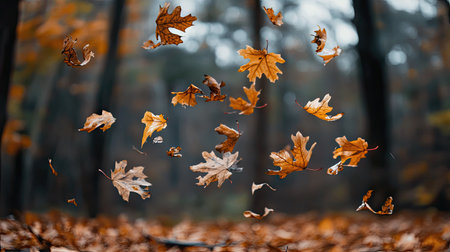 Dry oak and maple leaves caught mid-air as they dance in the wind, forest background slightly blurred