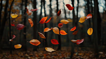 Leaves of various shades of orange, red, and yellow floating in mid-air against a blurred forest background
